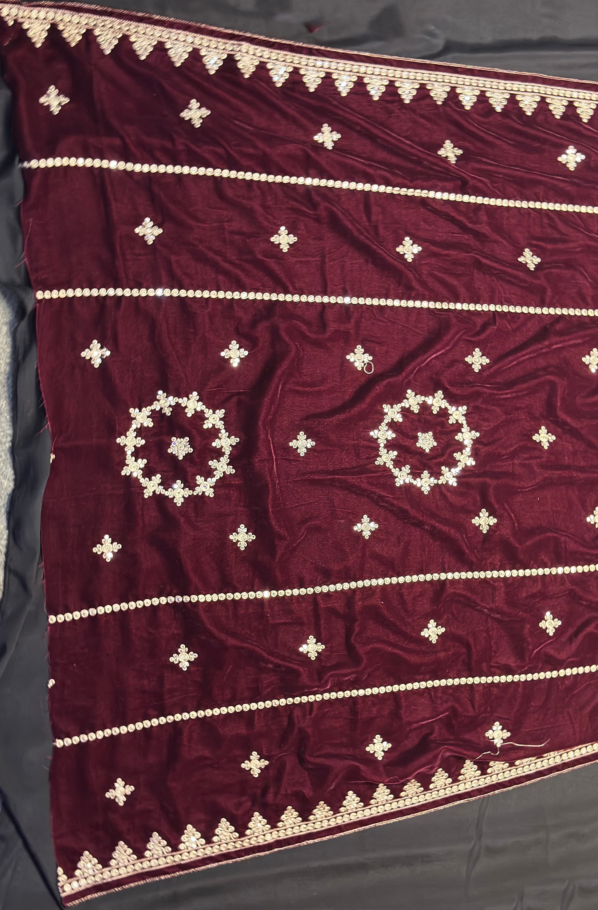 Bazo (Sleeves): Matching maroon fabric featuring small white embroidered motifs arranged in rows, adding continuity to the overall design.